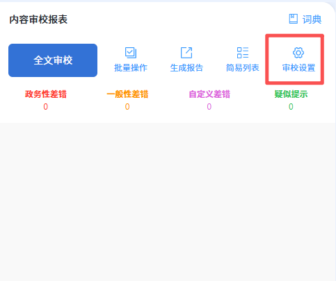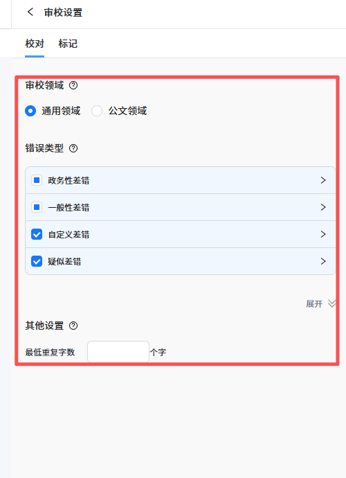 2.2 审校设置: 您上传文件后,可以在模块页面左侧预览文件整体内容,在右侧的功能栏,您可以点击 “审校设置”,您可以在里面设置您所需要的审校内容,有通用领域和公文领域的,也可以设置差错审校范围如:政务性差错,一般性差错,自定义差错,疑似差错等,选中后,即可点击“全文审校”,此时,方寸智脑的审校专家就开始为您审校材料。