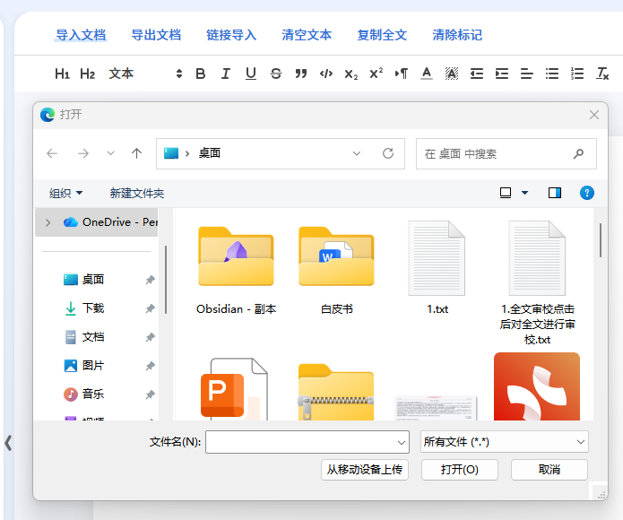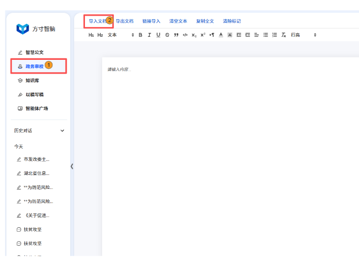进入方寸智脑后,您可以点击左侧模块栏的“智能审校”模块,在这里您可以预览审校模块的页面,点击左上角的导入文档,选择您需要审校的文档,如: