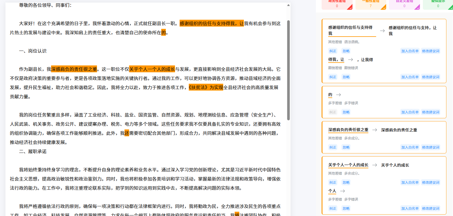 【核心价值:快速识别并文章中的政务性差错、知识性差错以及格式问题等,提升内容专业性和可读性,避免因文字疏漏导致的沟通误解或形象损失。】