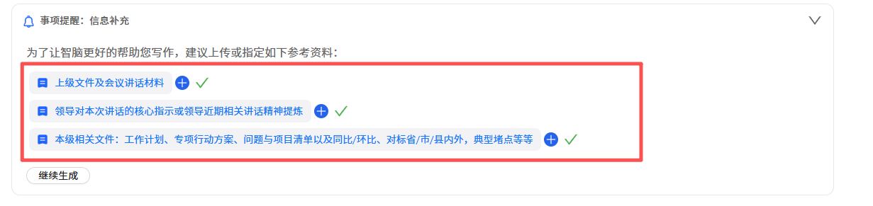 2.3 内容补充: 智脑为更准确把握您的写作需求,撰写更具针对性的公文,请您补充必要的参考资料。如下图: