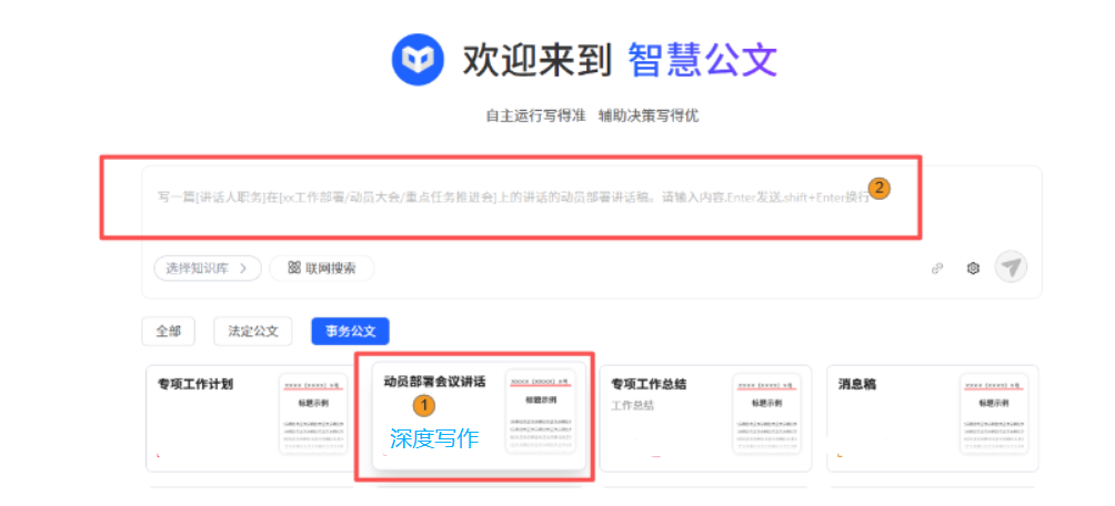 进入方寸智脑后,您可以点击左侧模块栏的“公文写作”模块,选择其中“事务公文”中的]“动员部署会议讲话”。选中后,对话框中出现该任务的相应提示:写一篇 [讲话人职务]在[xx 工作部署/动员大会/重点任务推进会]上的讲话的动员部署讲话稿。