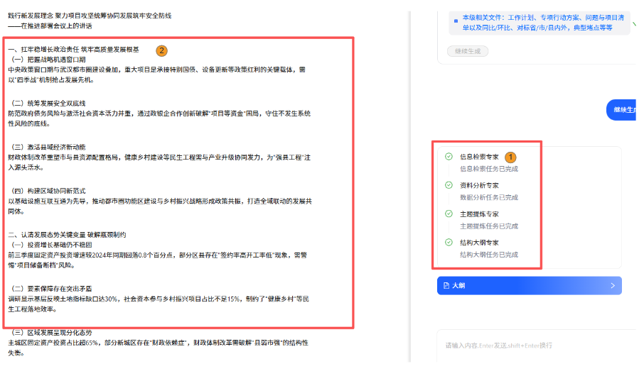 您补充资料完毕后点击继续生成,您可以看见方寸智脑开始调用信息检索专家-资料分析专家-主题提炼专家-结构大纲专家,开始分析并了解您的任务背景,参考相关政务数据,为您拟定一份内容详实的动员部署会议讲话大纲。