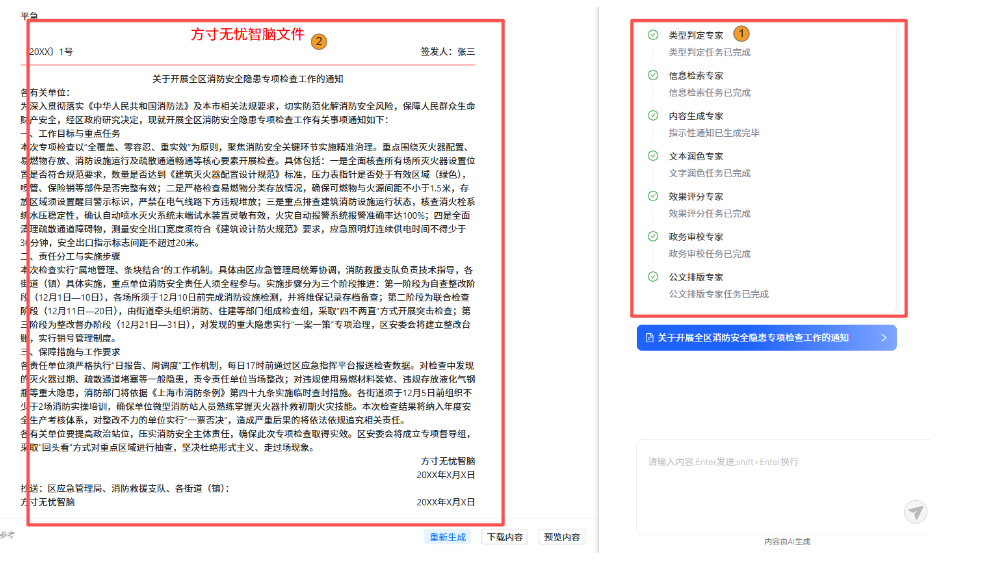 假设您是机关工作人员,需要就某项工作或活动发布通知。传统流程需查阅大量公文范例、反复修改措辞、确保格式规范,耗时许久。现在,借助方寸智脑,您只需10-15分钟即可完成从需求描述到符合规范的《通知》初稿。