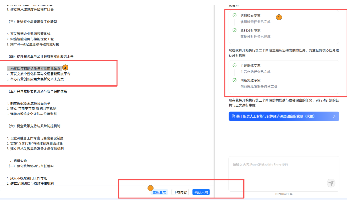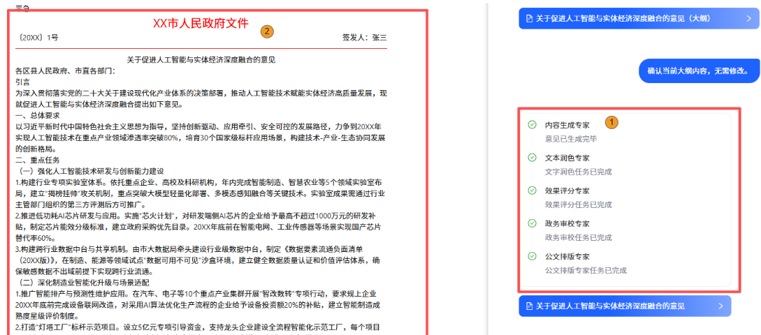 当您确认无误后并点击确认大纲后,智脑将会依据大纲进行内容生成,期间已包含文本润色专家对文本进行润色处理、效果评分专家为您进行内容评分、政审专家为您进行内容审校、公文排版专家为您进行内容排版,最后给您的是一篇质量高、查重低、错误少的可直接应用的文稿。