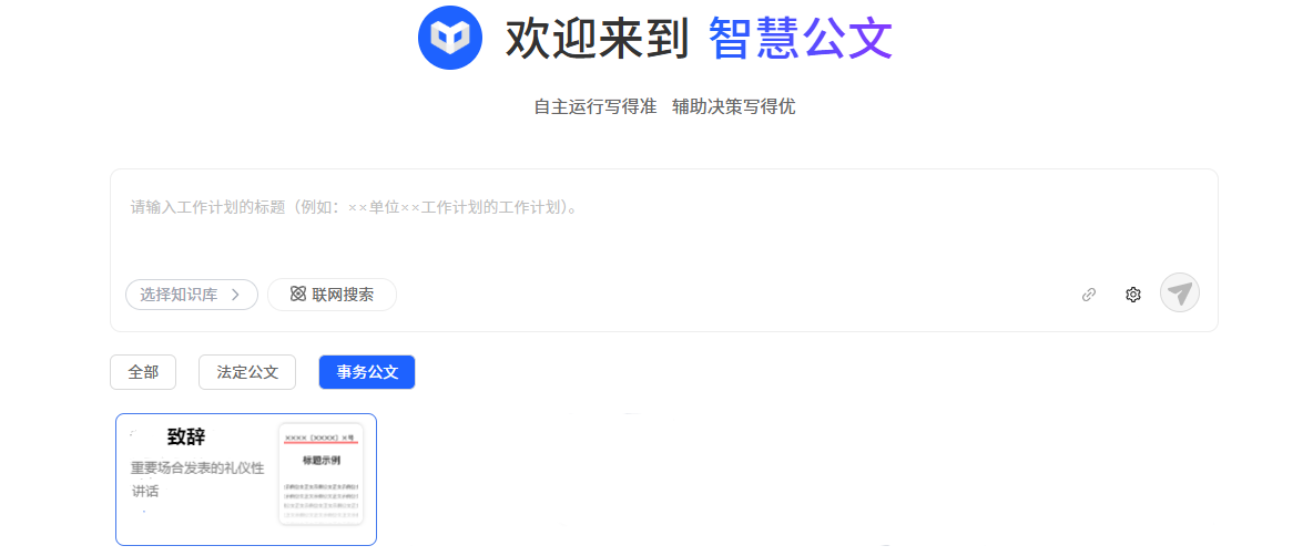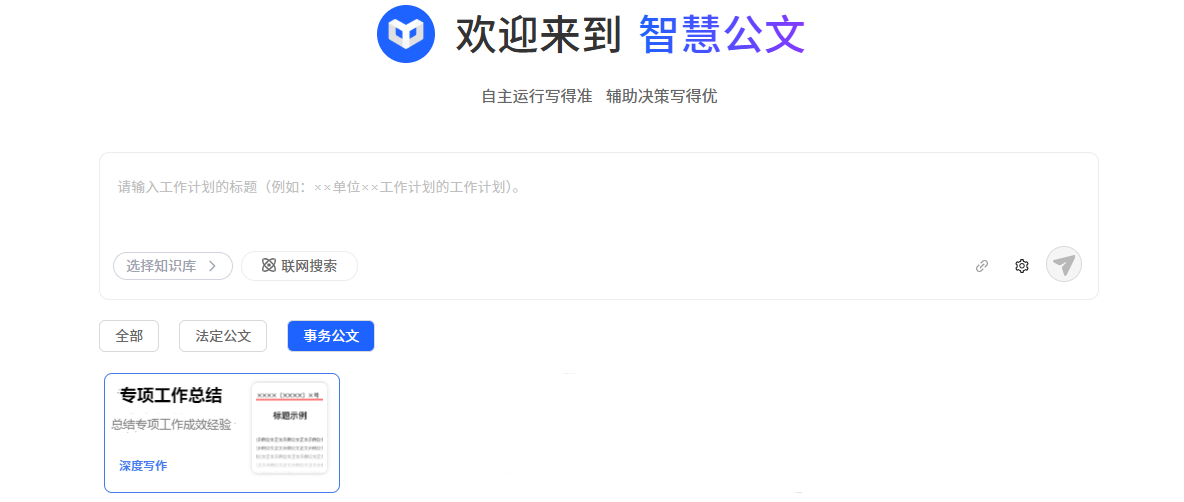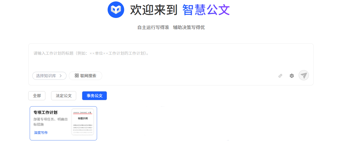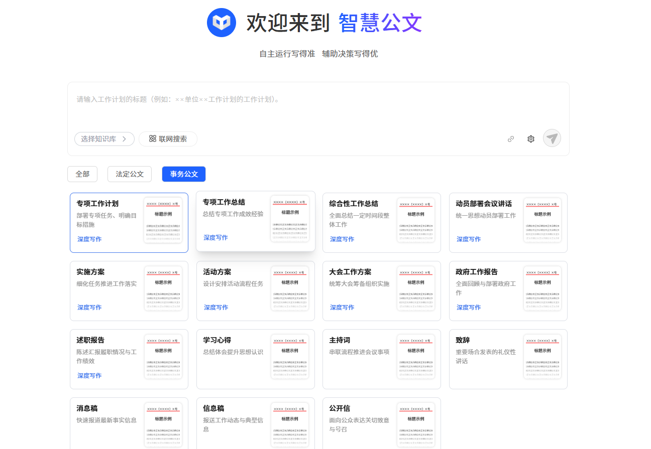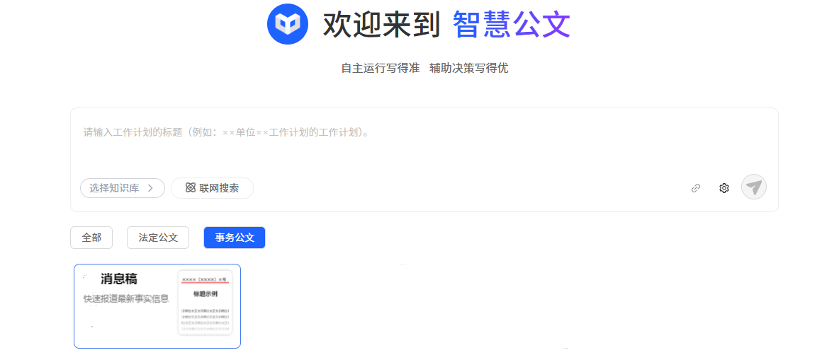事务公文现已更新 15 个文种:专项工作计划、专项工作总结、动员部署会议讲话、消息稿、主持词、致辞、学习心得、信息稿、公开信。后续将持续更新到 30 种以上,全面覆盖政企办公常用事务场景。