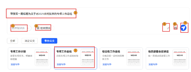 1.2 对话框: 用户在对话框输入指定内容后,如:"帮我写一篇标题为关于对 2025 农村扶贫的专项工作总结"。
