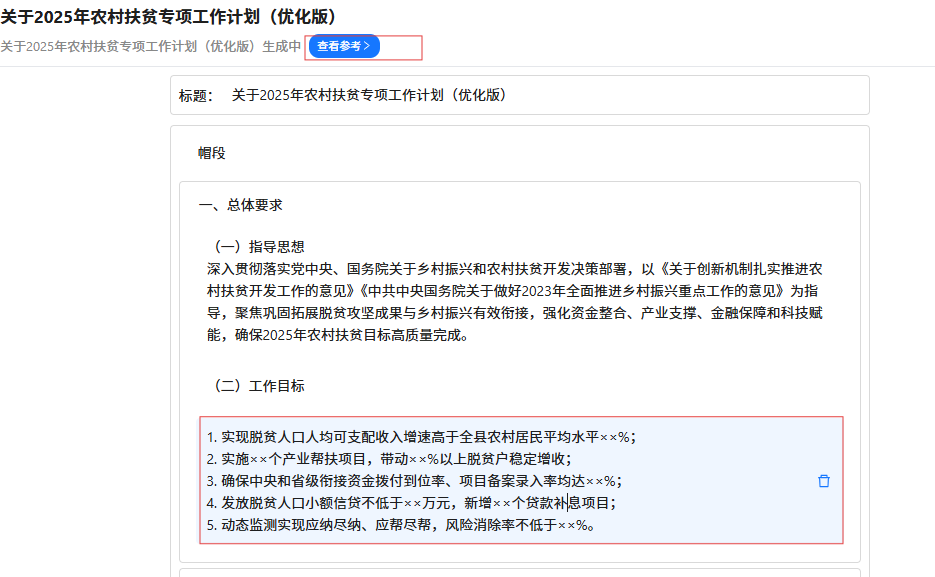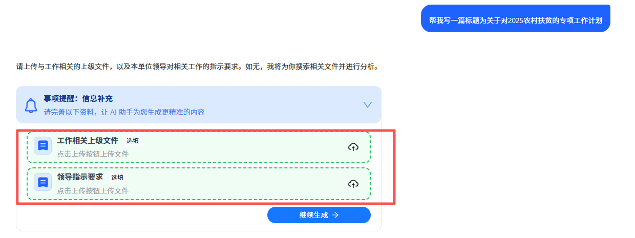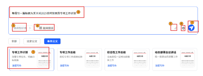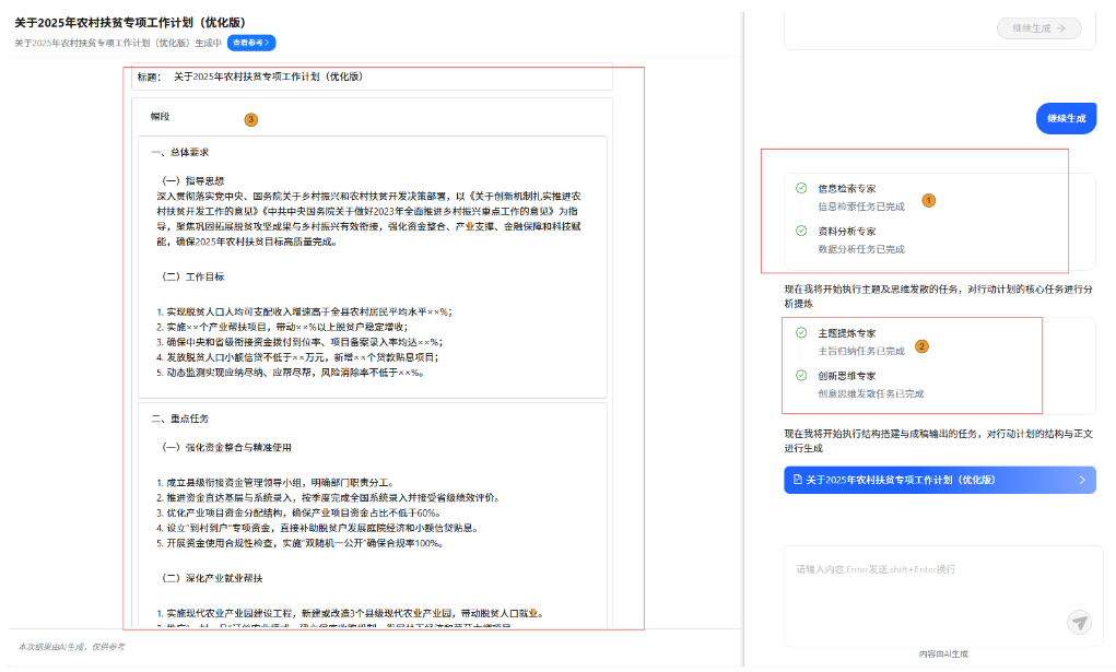 1.2 对话框: 用户在对话框输入指定内容后,如:"帮我写一篇标题为关于对 2025 农村扶贫的专项工作计划"。