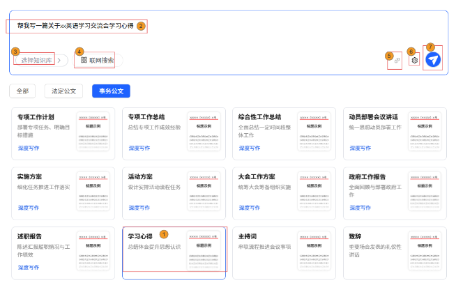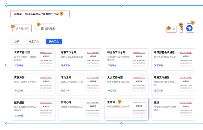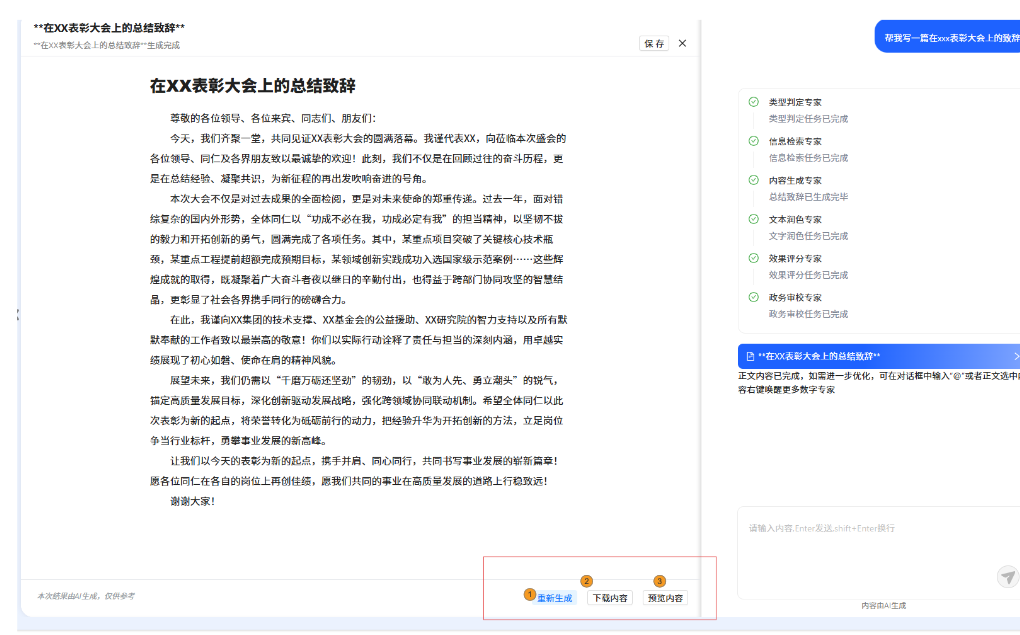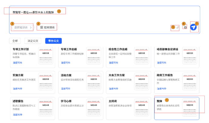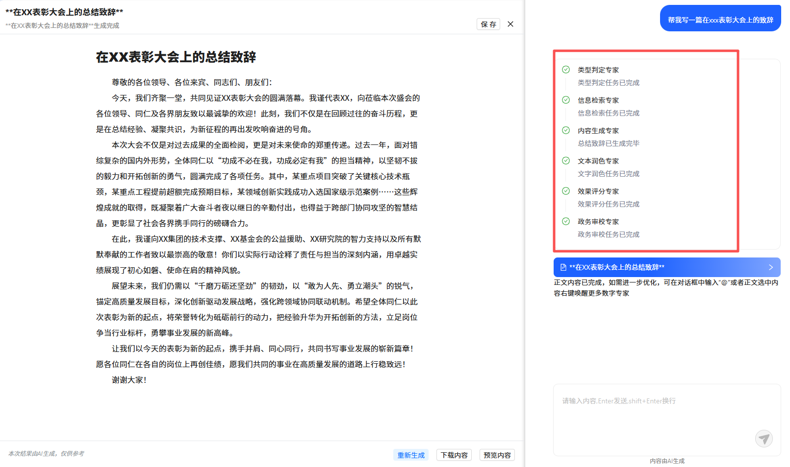 1.2 对话框: 用户在对话框输入指定内容后,如:"帮我写一篇在 xxx 表彰大会上的致辞"。