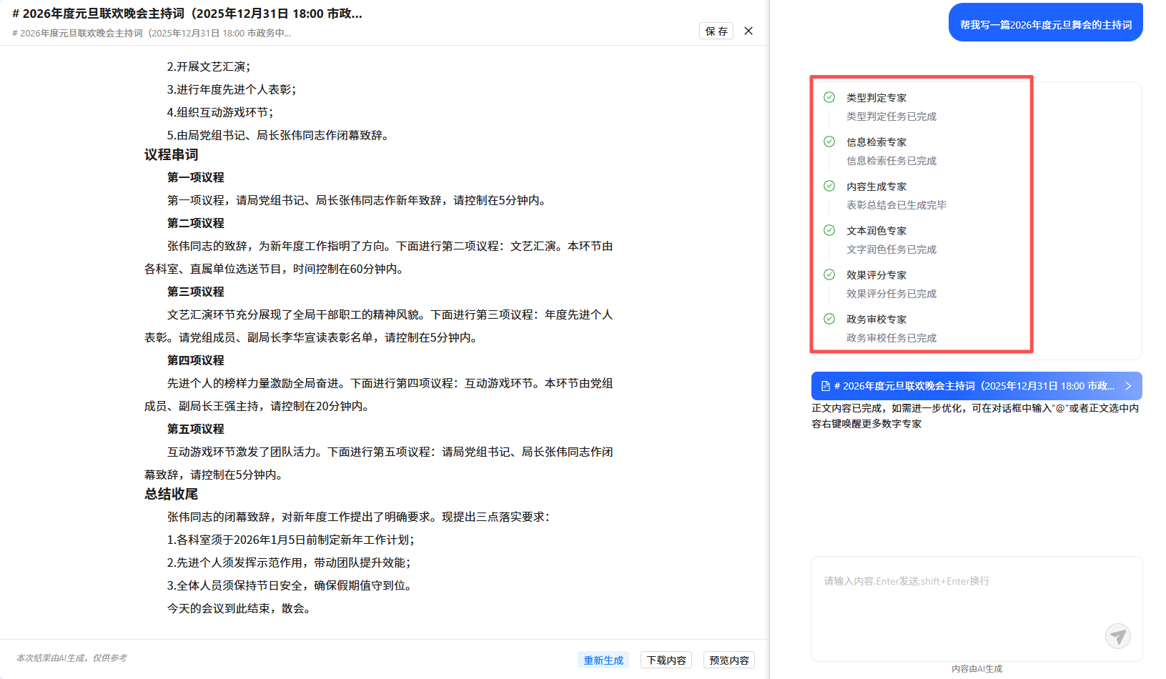 当您点击运行后,智脑自动为您调用类型判定专家-信息检索专家-内容生成专家-文本润色专家-效果评分专家-政务审校专家 为您生文。