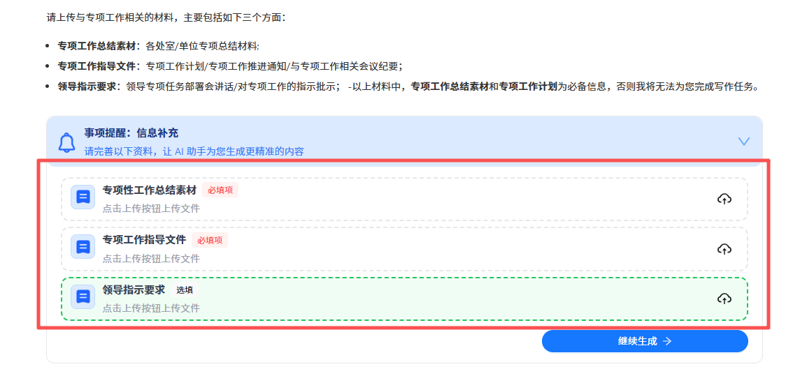 点击运行后智脑将会提醒您上传必填项专项性工作总结素材和专项工作指导文件与选填项领导指示要求 为您生成更精准有针对性的内容