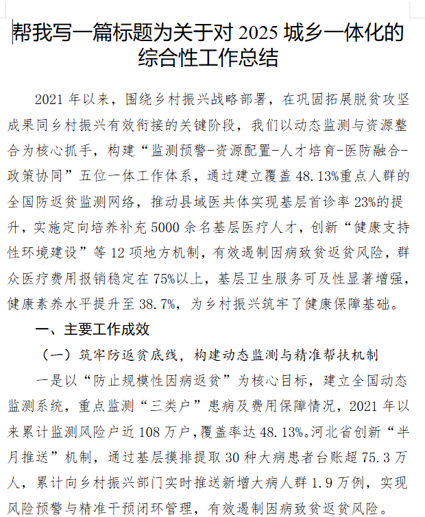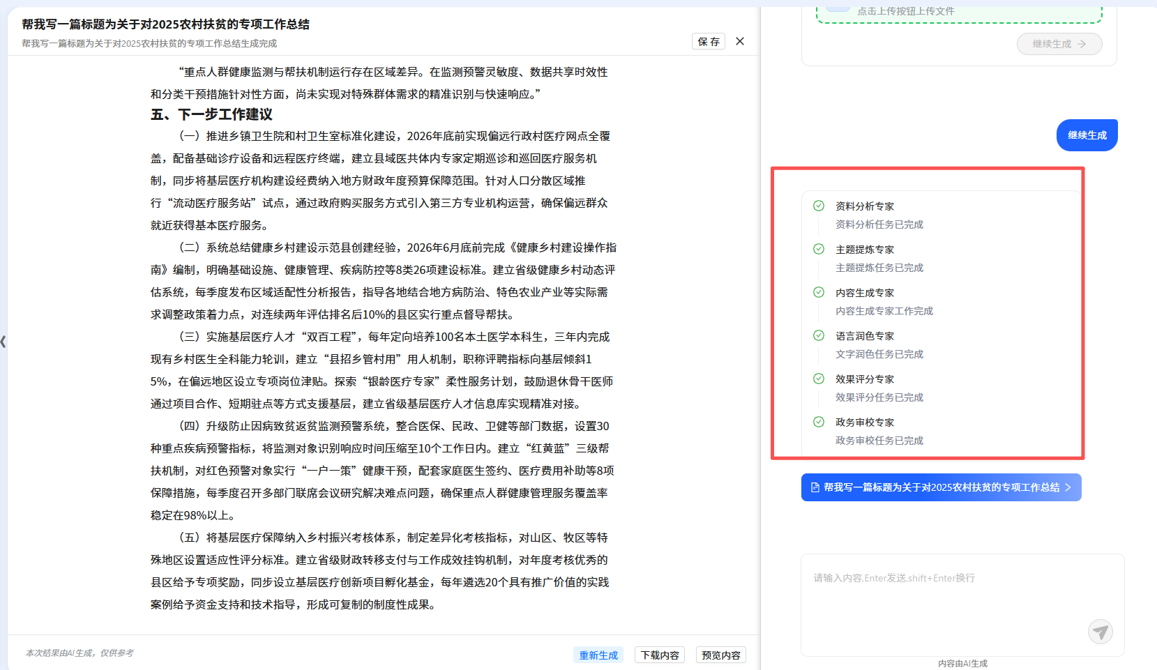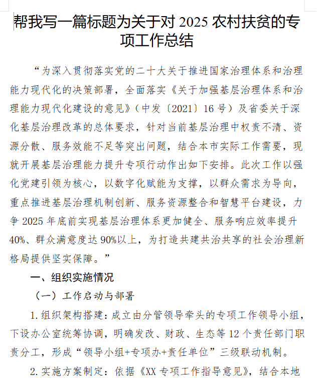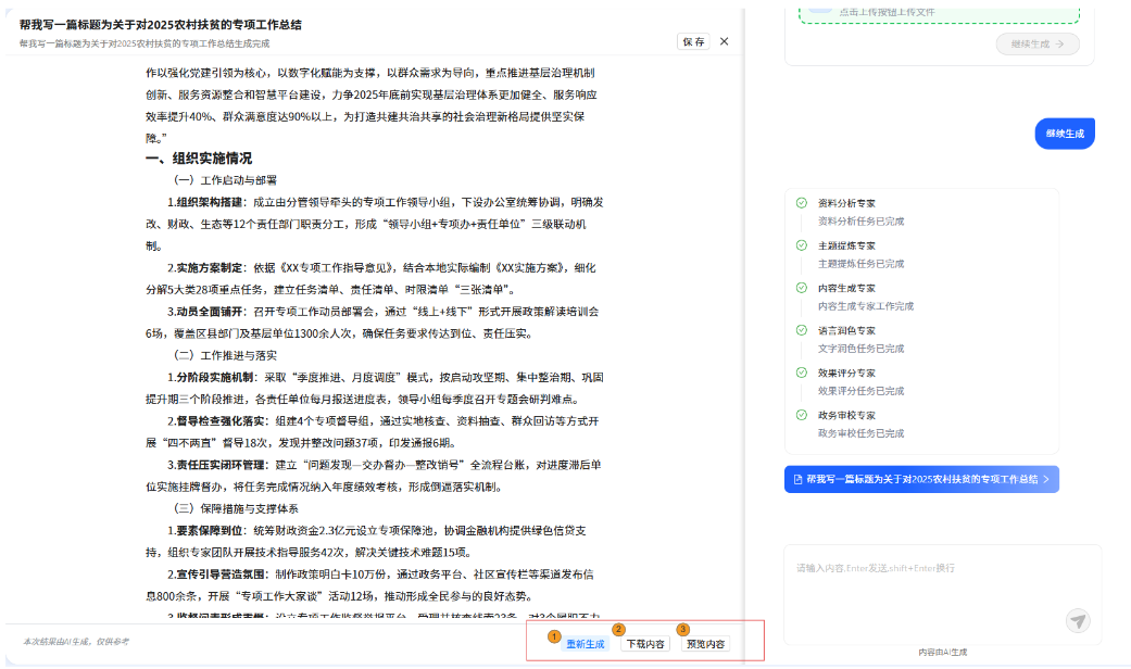 1.2 对话框: 用户在对话框输入指定内容后,如:"帮我写一篇标题为关于对 2025 农村扶贫的综合性工作总结"。