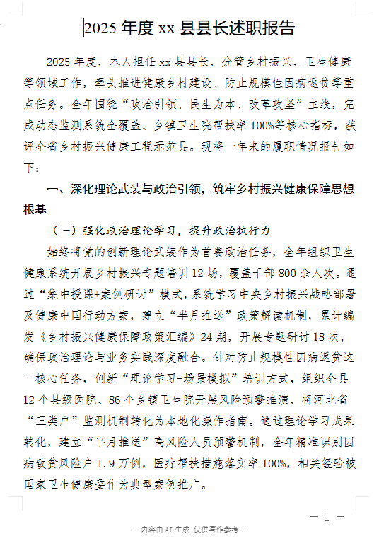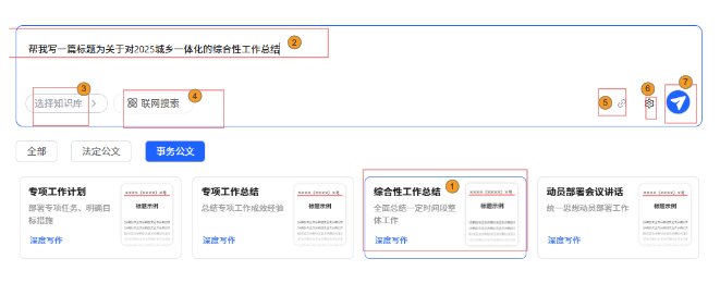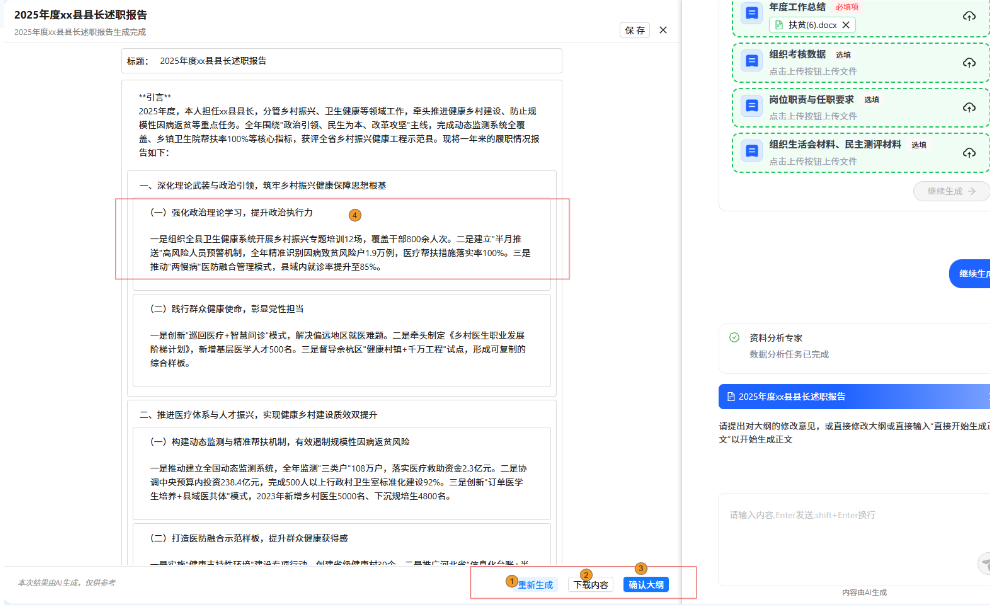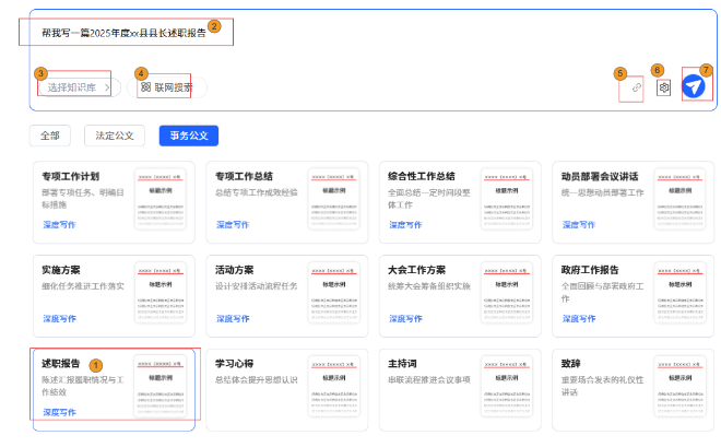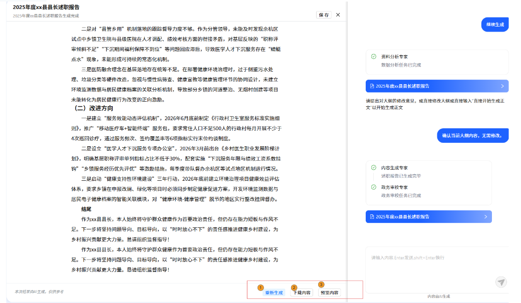 1.2 对话框: 用户在对话框输入指定内容后,如:"帮我写一篇 2025 年度 xx 县县长述职报告"。