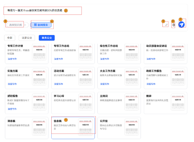 1.2 对话框: 用户在对话框输入指定内容后,如:"帮我写一篇关于 xxx 县扶贫完成率超 90%的信息稿"。
