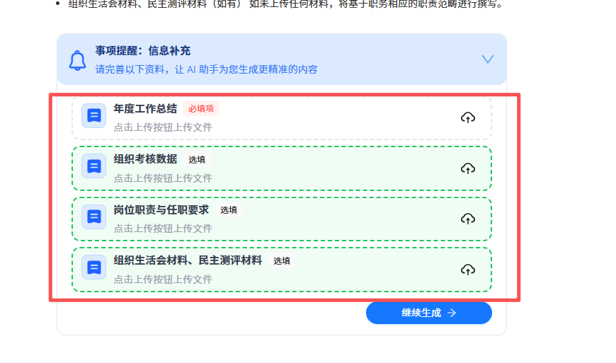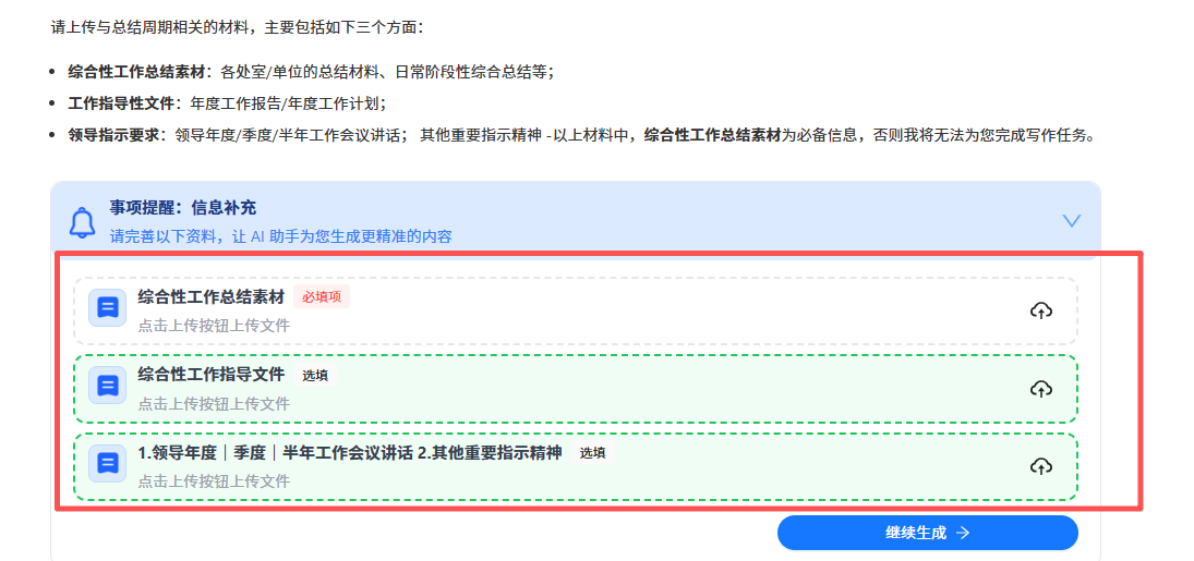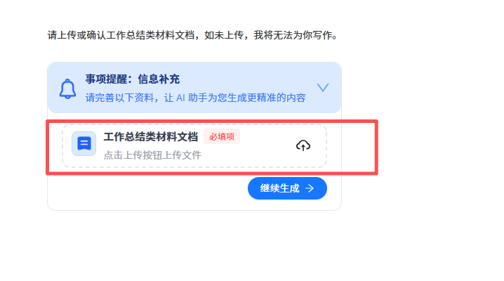 您点击运行后,智脑会提醒您上传工作总结类材料文档必填补充信息。