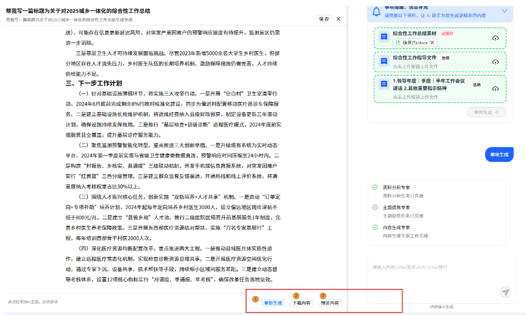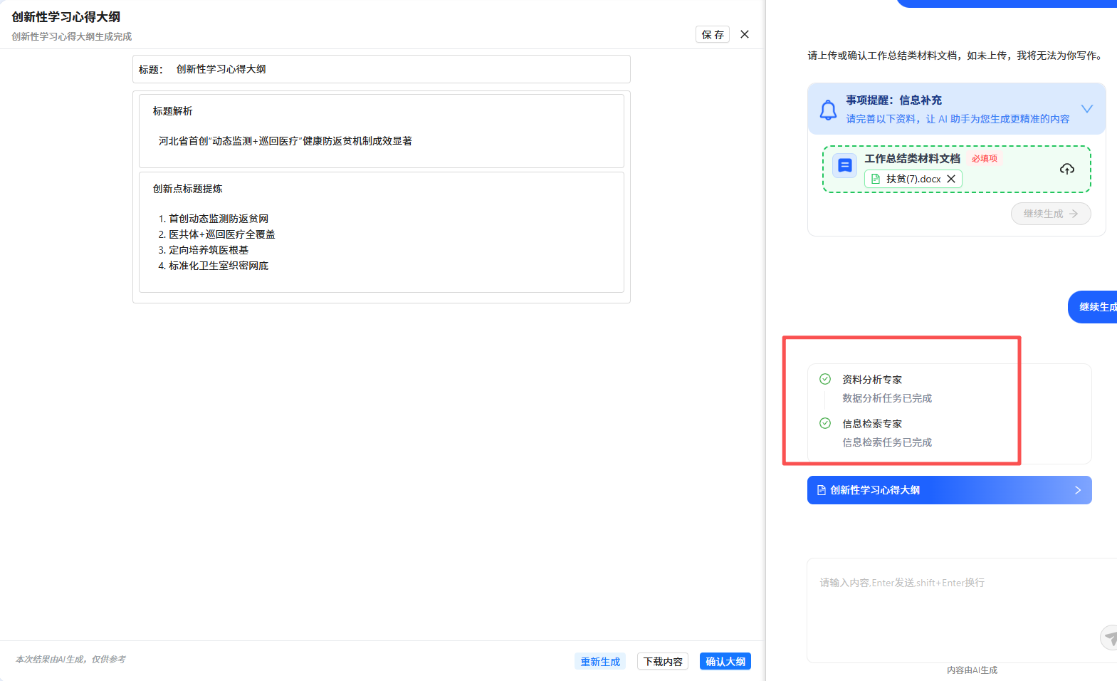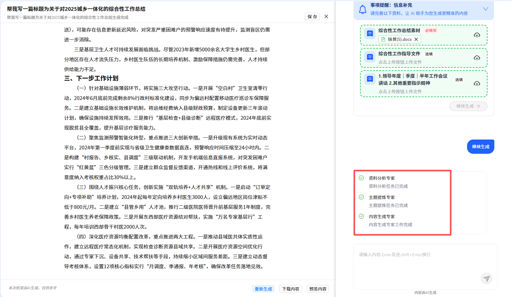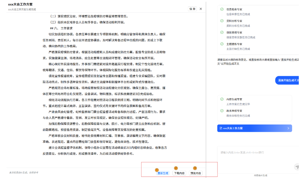 当您补充完毕后点击继续生成,智脑会继续调用 资料分析专家-主题提炼专家-内容生成专家 为您生文,您将会看到如下界面: