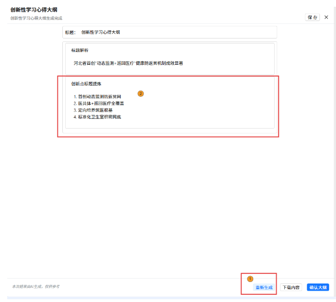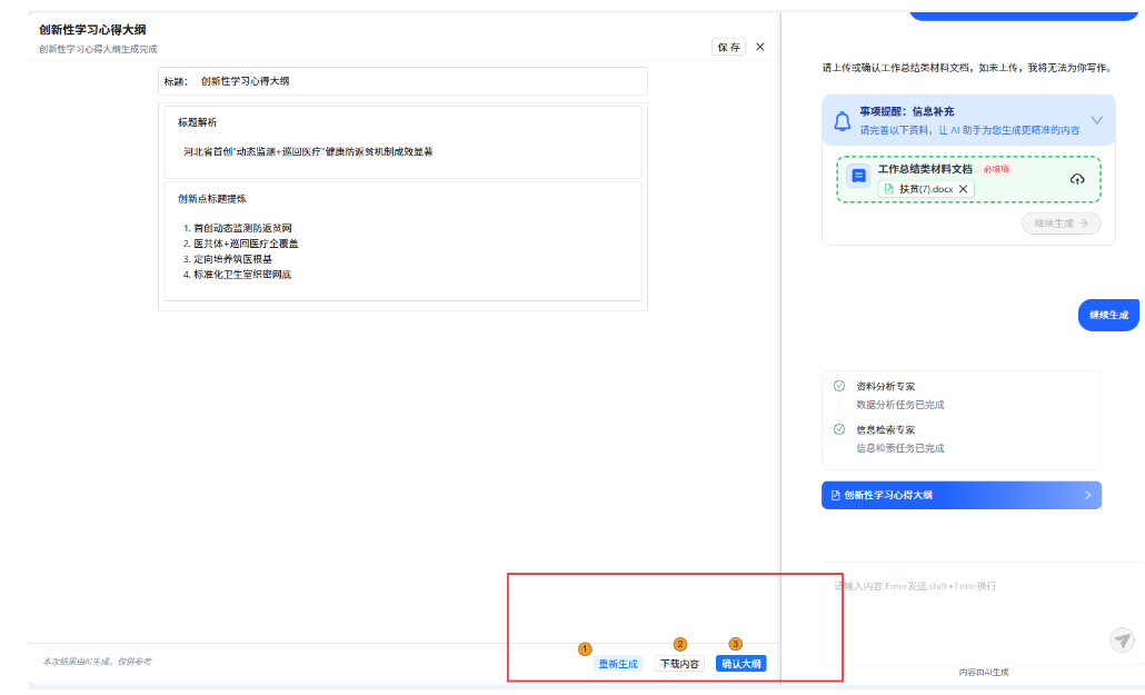您在此页面中可点击底部的 重新生成,下载内容,确认大纲