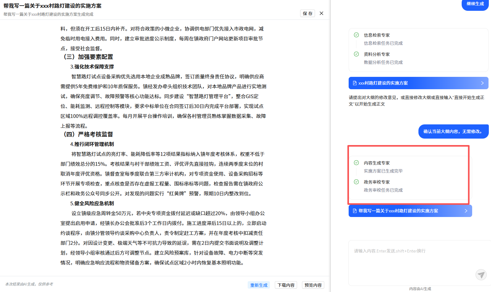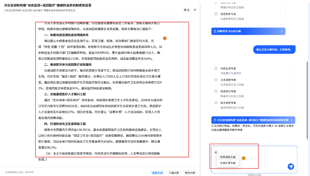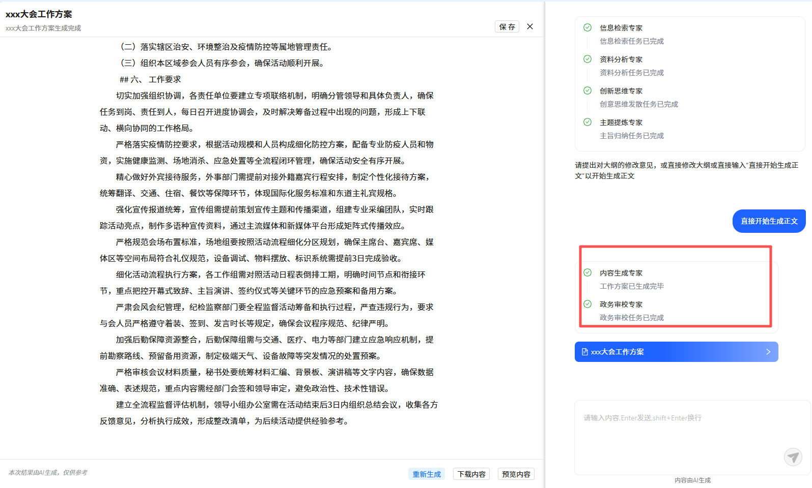 您点击确认大纲后,智脑自动帮您调用内容生成专家-文本润色专家-效果评分专家-政务审校专家为您生文。