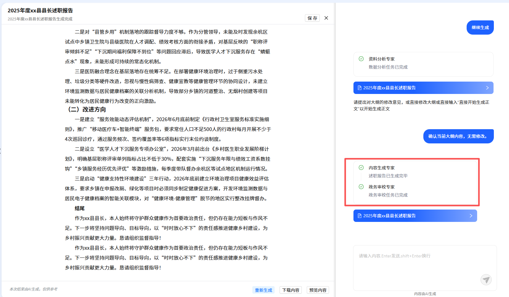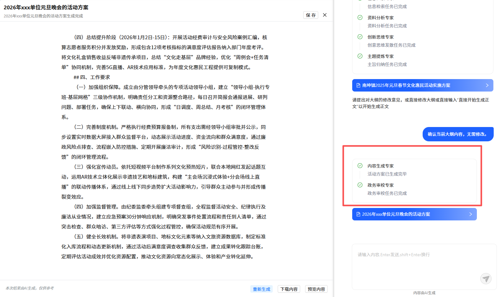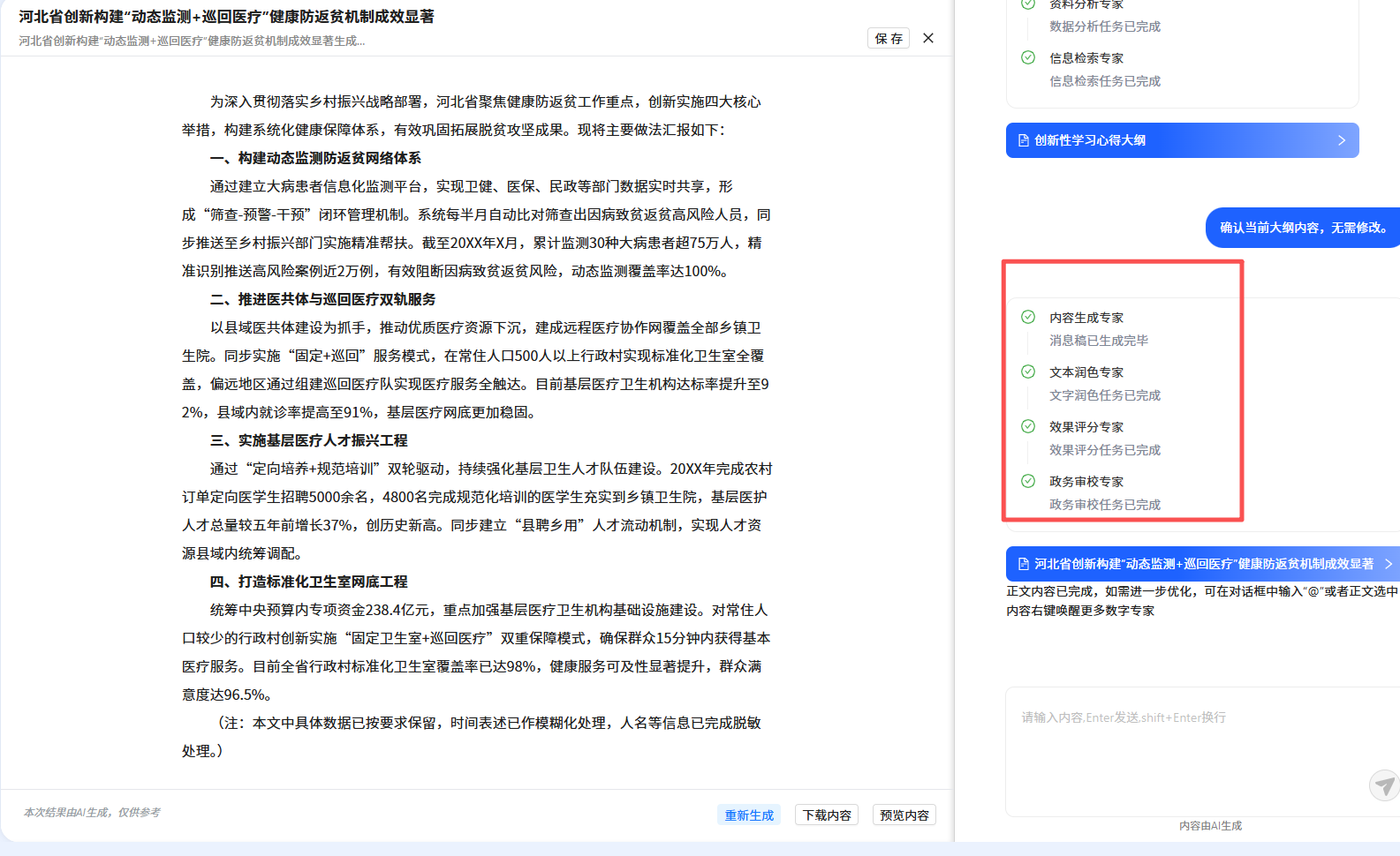 您点击确认大纲后,智脑自动帮您调用内容生成专家-文本润色专家-效果评分专家-政务审校专家为您生文。