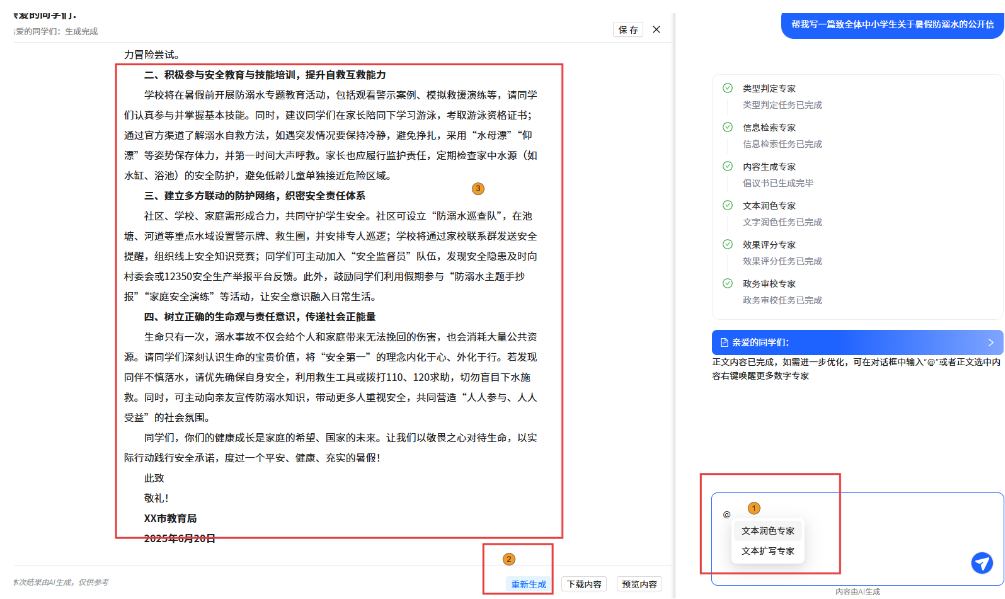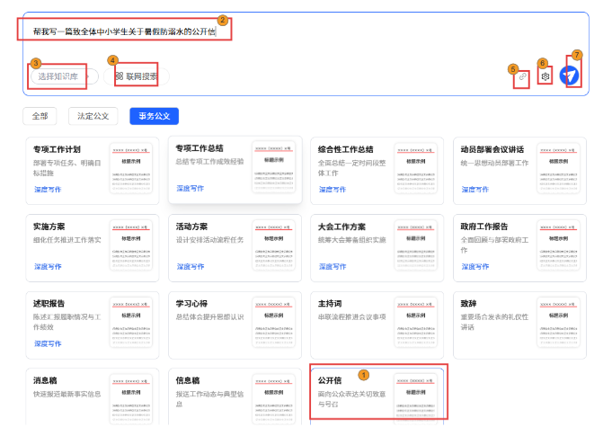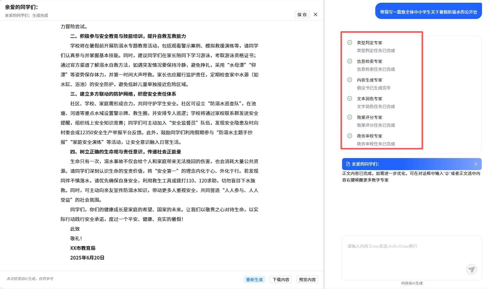 1.2 对话框: 用户在对话框输入指定内容后,如:"帮我写一篇致全体中小学生关于暑假防溺水的公开信"。