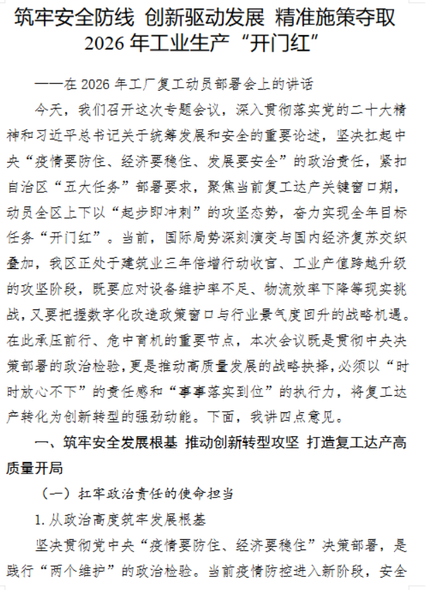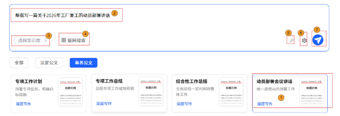 1.2 对话框: 用户在对话框输入指定内容后,如:"帮我写一篇关于 2026 年工厂复工的动员部署讲话"。