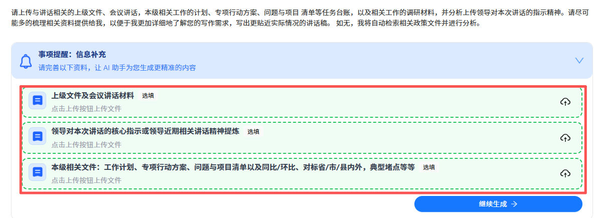 点击运行后智脑将会提醒您上传上级文件及会议讲话材料,领导对本次讲话的核心知识和本级相关文件等选填文件 为您生成更精准有针对性的内容。