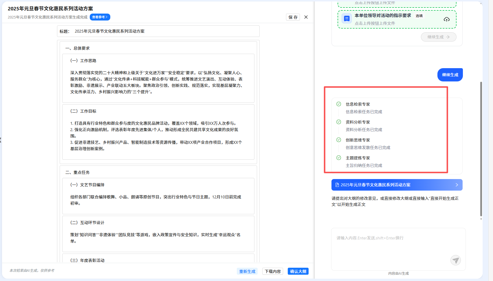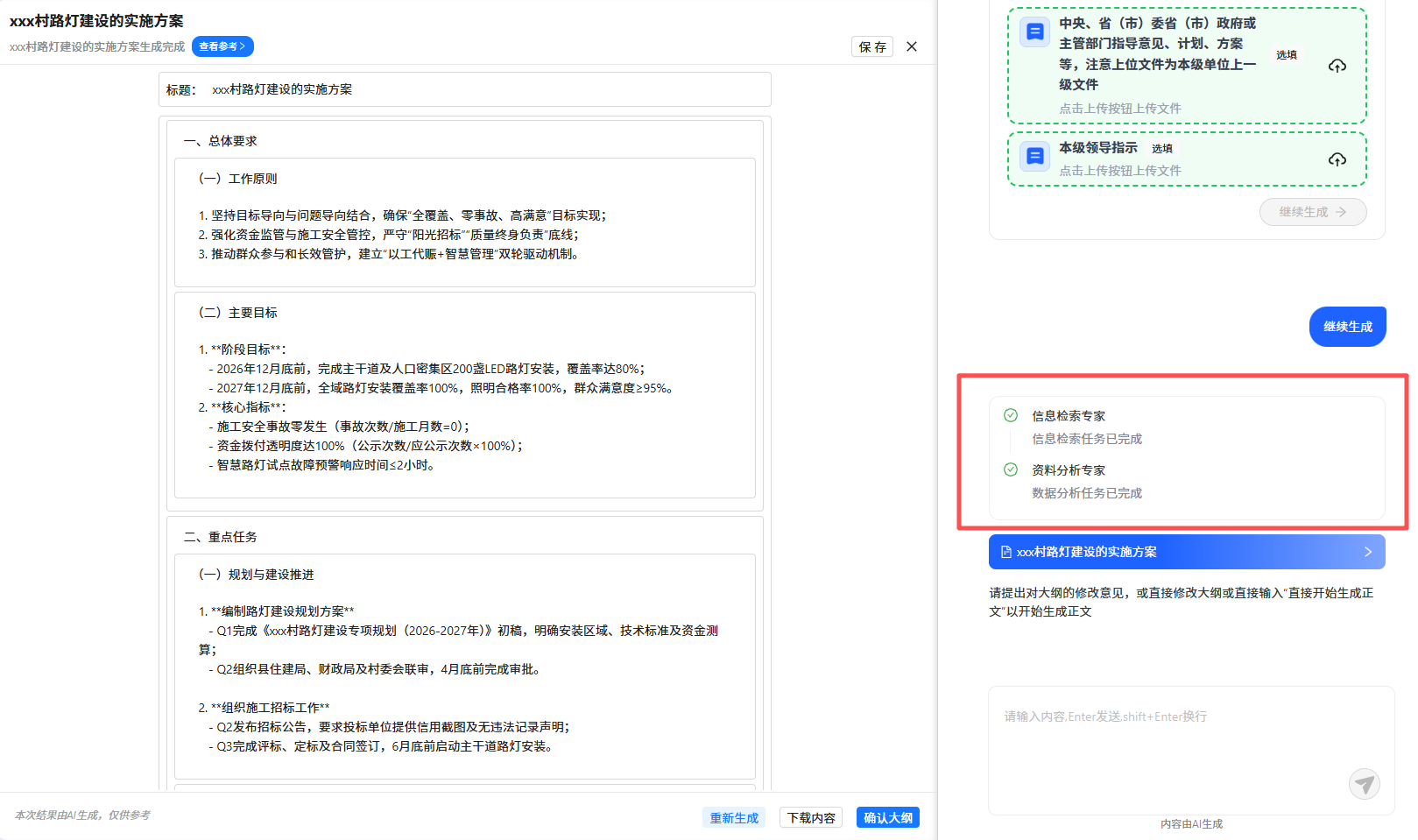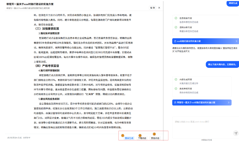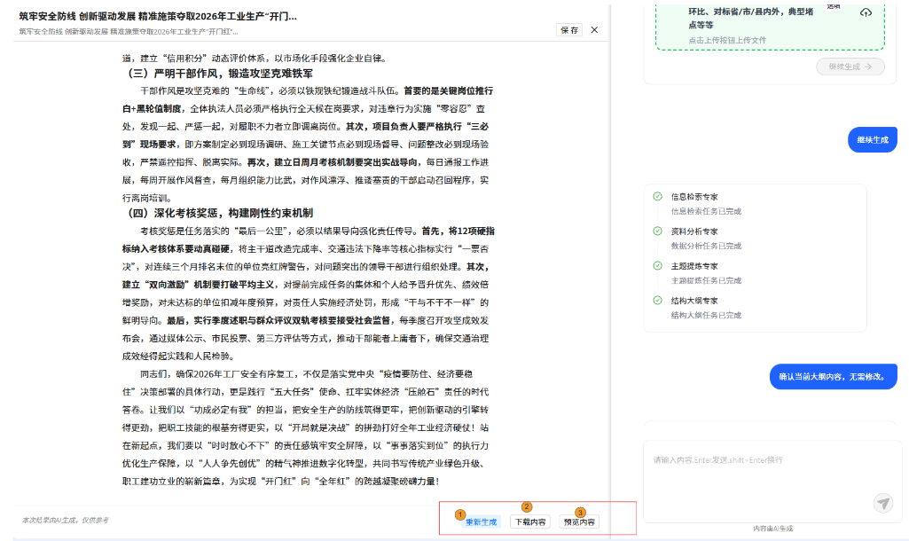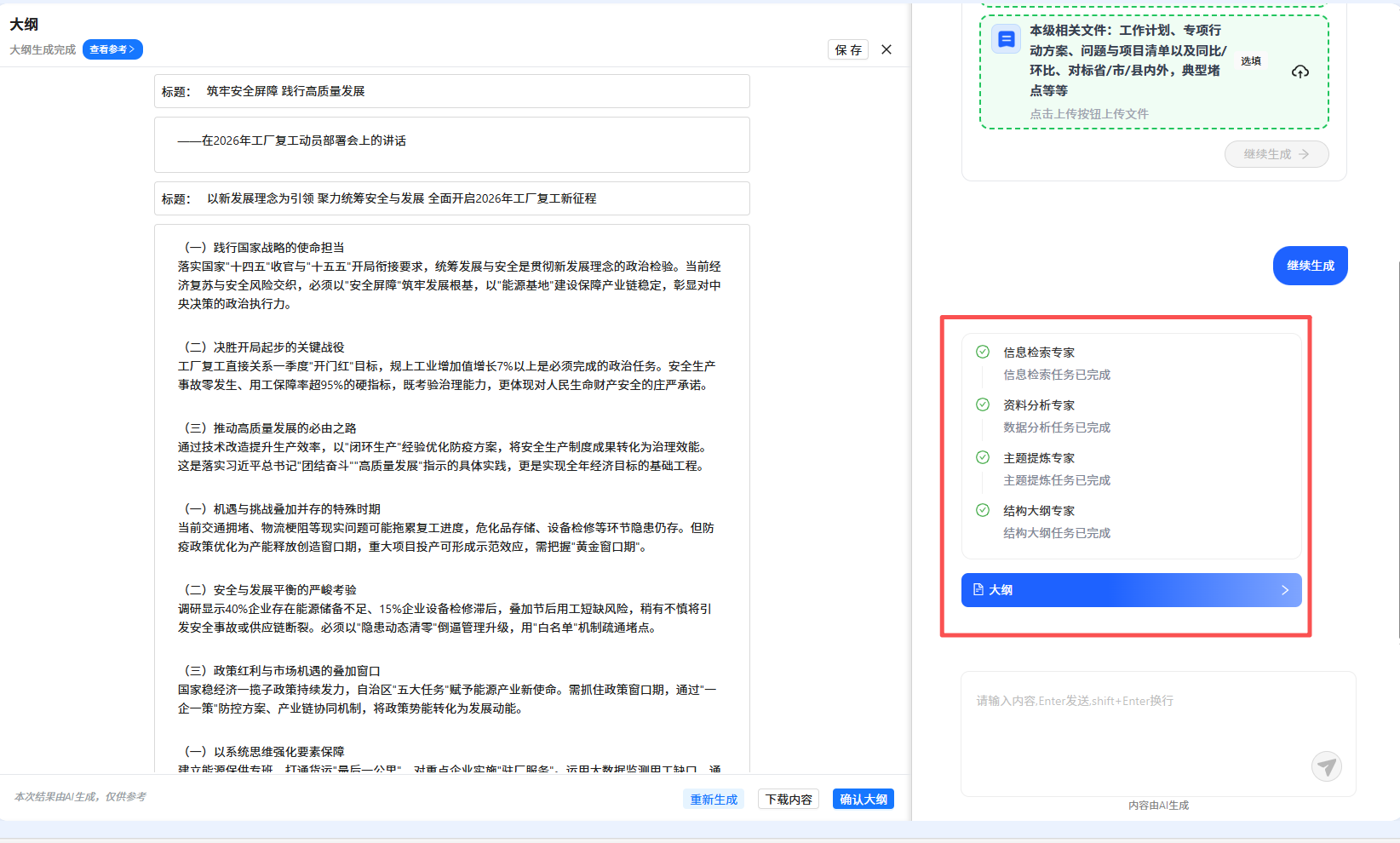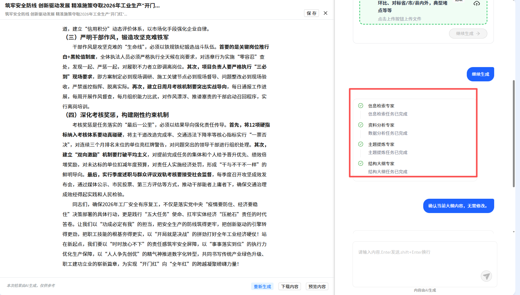 若您对此次大纲满意,点击确认大纲继续生文。智脑将会自动调用内容生成专家-文本润色专家-效果评分专家-政务审校专家为您生文。