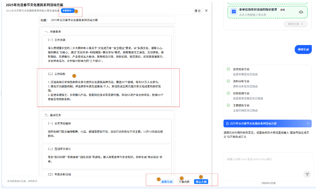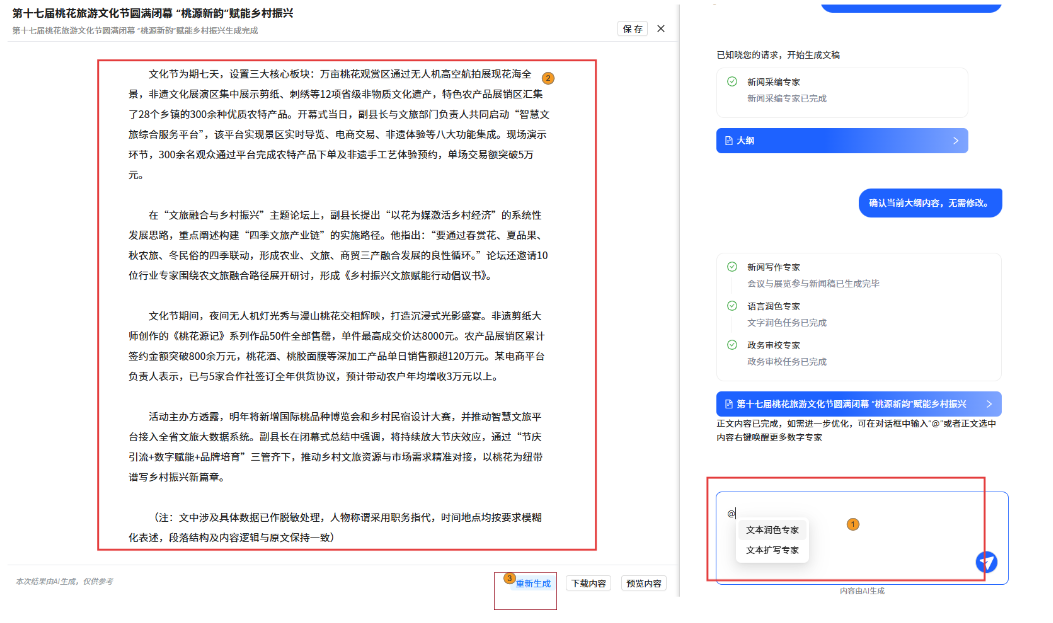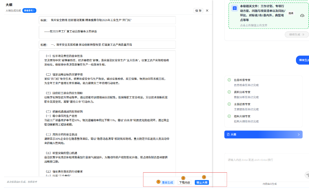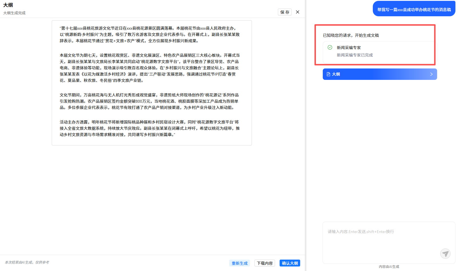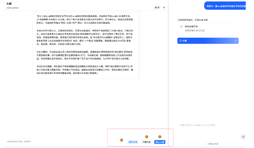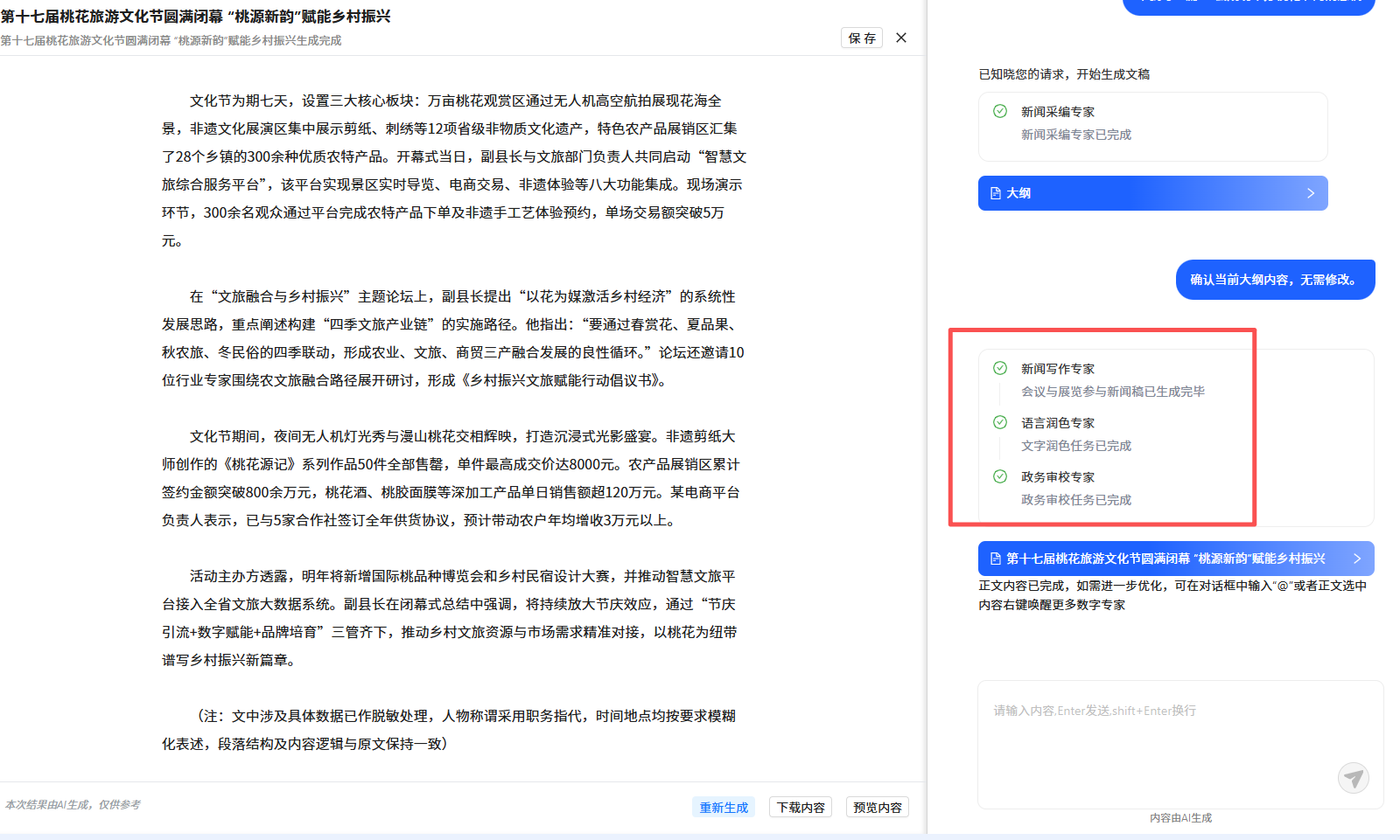 若您满意大纲,您可点击确认大纲,智脑将会自动调用新闻写作专家-语言润色专家-政务审校专家为您生文。