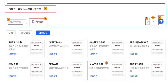 1.2 对话框: 用户在对话框输入指定内容后,如:"帮我写一篇关于 xxx 大会工作方案"。