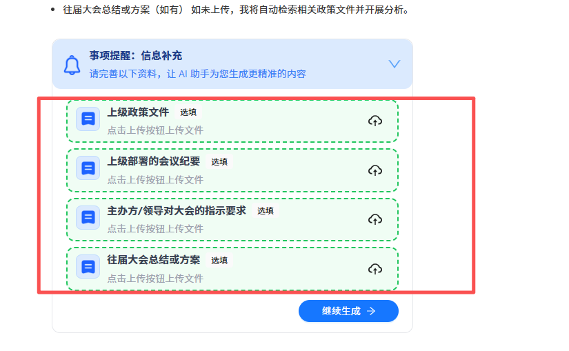 您点击运行后,智脑会提醒您补充上级政策文件-上级部署的会议纪要-主办方对大会的指示要求-往届大会总结或方案等选填文件帮助您生成更有针对性的内容。