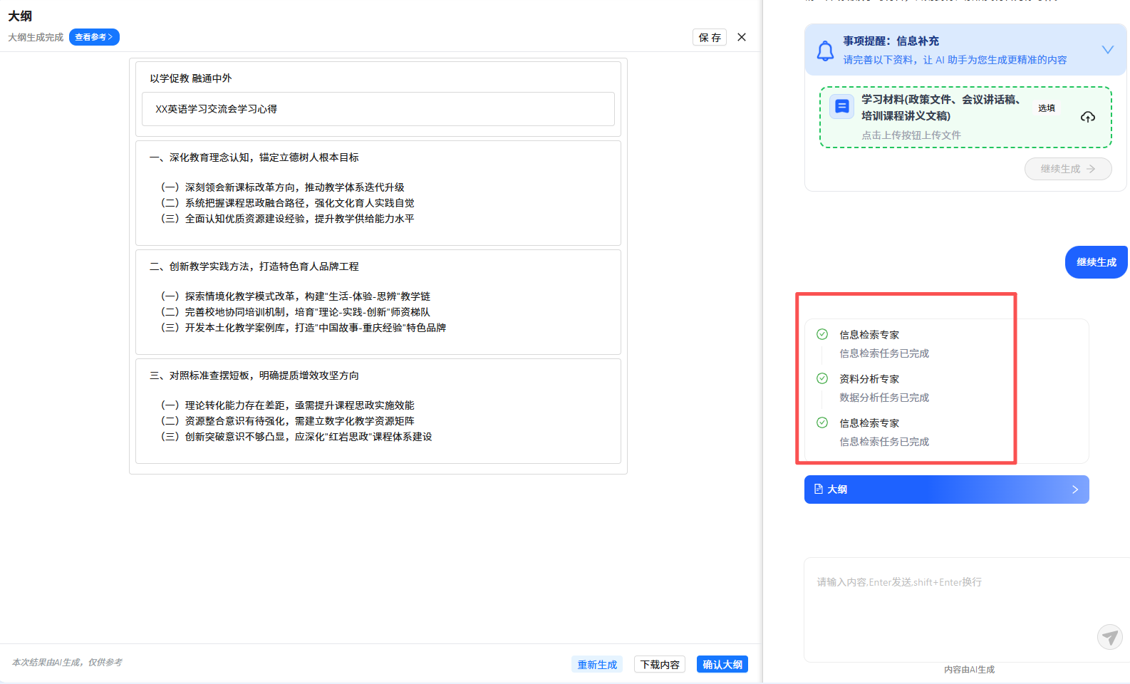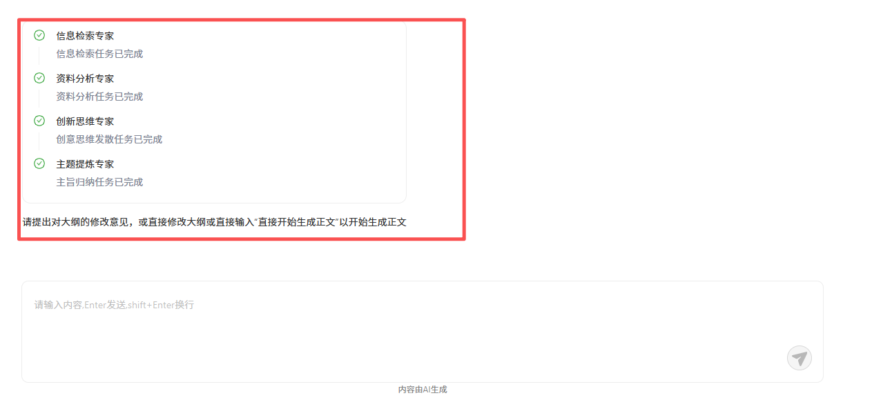 待您补充完毕后,智脑自动为您调用信息检索专家-资料分析专家-创新思维专家-主题提炼专家为您生成大纲,此时智脑会提醒您是否修改大纲或直接开始生成正文: