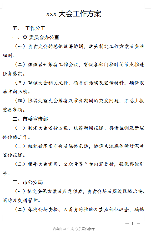 1.写作场景: 用于筹备和组织重要会议(如党代会、人代会、工作部署会、表彰大会、专题推进会等)前,为确保会议主题鲜明、流程规范、组织有序、保障有力而制定的综合性执行文件。