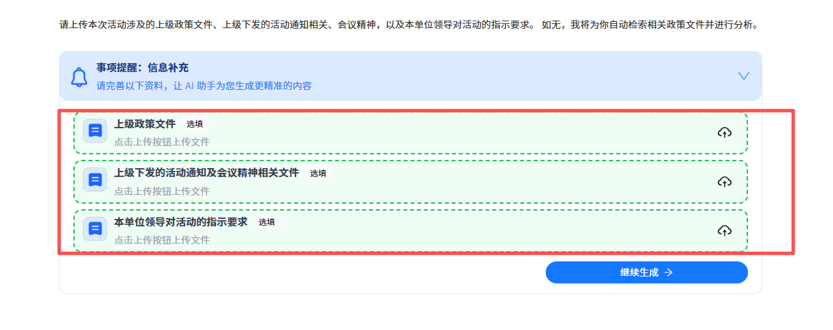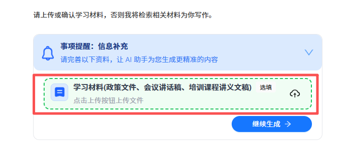 点击运行后智脑将会提醒您上传工作相关上级文件与领导指示要求等以补充信息为您生成更精准有针对性的内容