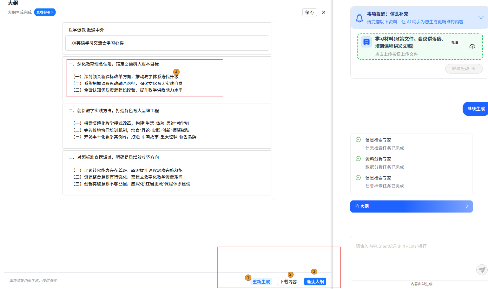 在此界面中,您可点击底部重新生成,下载内容,确认大纲。