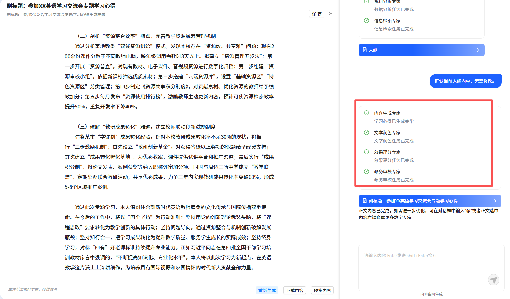 您确认大纲后,智脑继续为您调用内容生成专家-资料分析专家-主题提炼专家-结构大纲专家 为您生成全文。