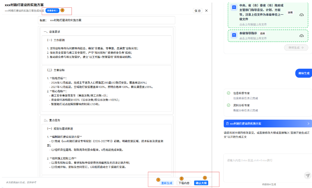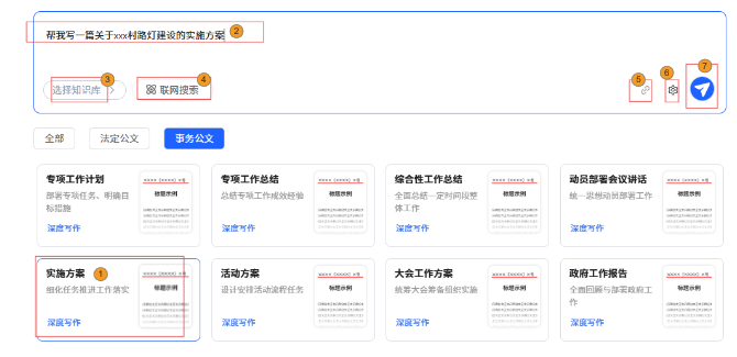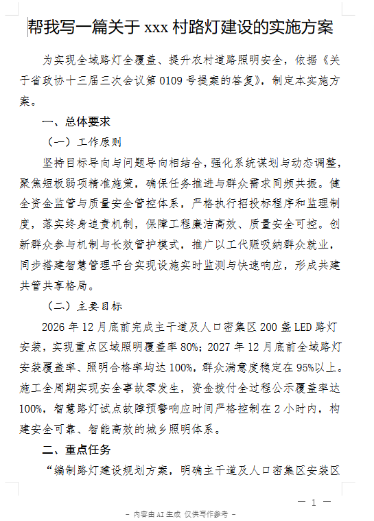 1.2 对话框: 用户在对话框输入指定内容后,如:"帮我写一篇关于 xxx 村路灯建设的实施方案"。