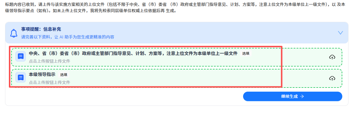 您点击运行后,智脑会提醒你您上传补充信息 与实施方案有关的上位文件,本级领导指示 为您更精准生成内容。