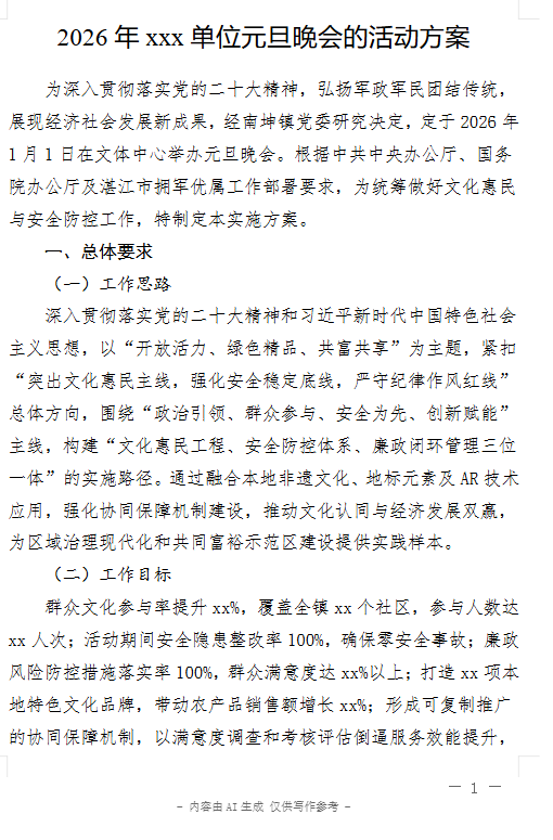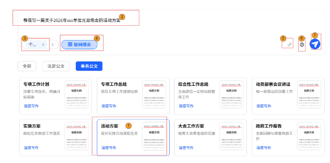 1.2 对话框: 用户在对话框输入指定内容后,如:"帮我写一篇关于 2026 年 xxx 单位元旦晚会的活动方案"。