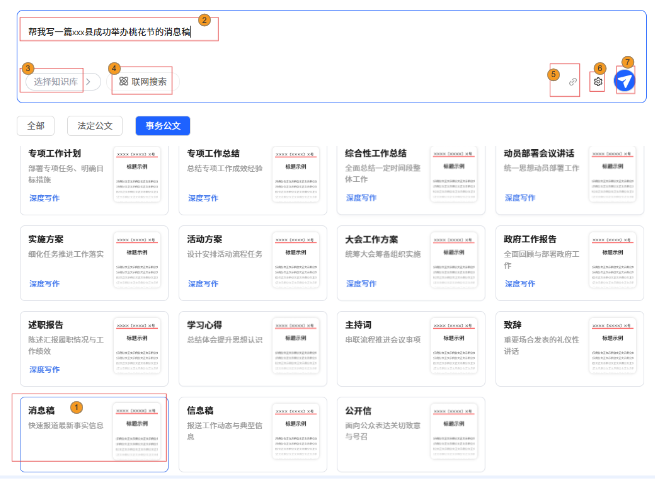 3 .方寸智脑执行过程: 用户选择《消息稿》文种并在对话框输入指定内容后,如:"帮我写一篇 xxx 县成功举办桃花节的消息稿",点击“确认”按钮。
