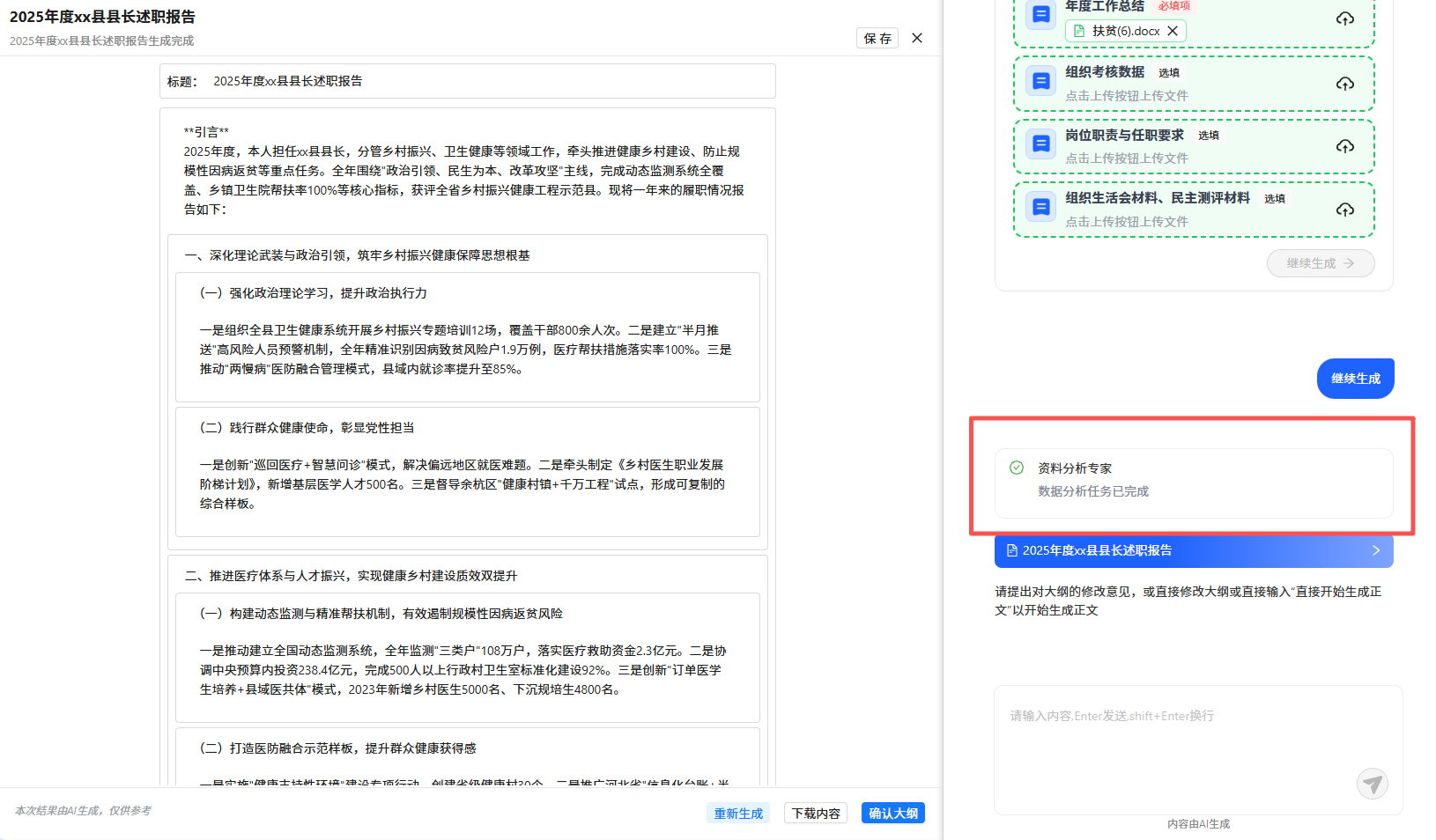 3 .方寸智脑执行过程: 用户选择《述职报告》文种并在对话框输入指定内容后,如:"帮我写一篇 2025 年度 xx 县县长述职报告",点击“确认”按钮。